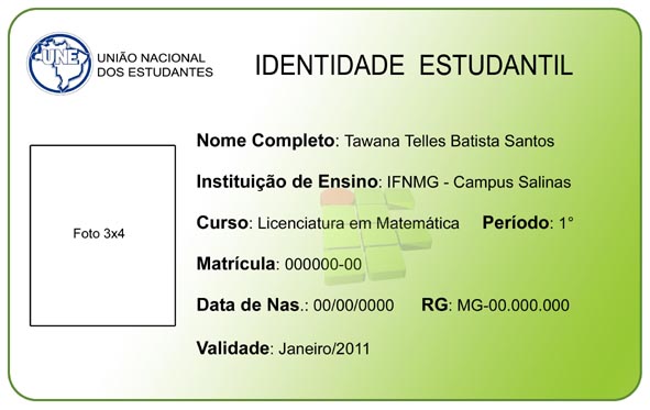 Frente: Logomarca da UNE, foto do aluno(a) e os seguintes dados: