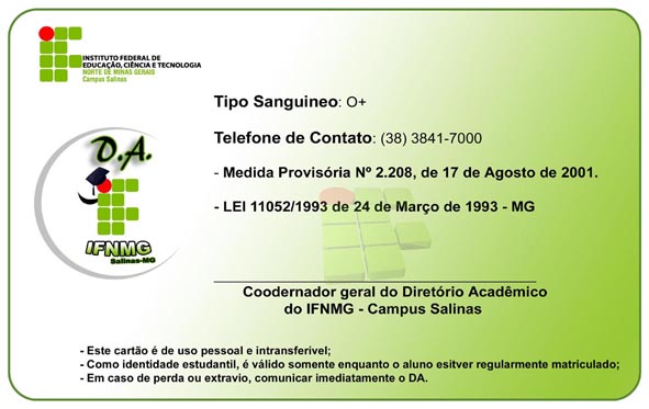 Verso: Logomarca do IF, logomarca do DA, tipo sanguíneo, telefone de contato (IF) , Portarias e leis dos direitos do estudante, Assinatura e Carimbo do Coordenador Geral do DA; os dizeres: